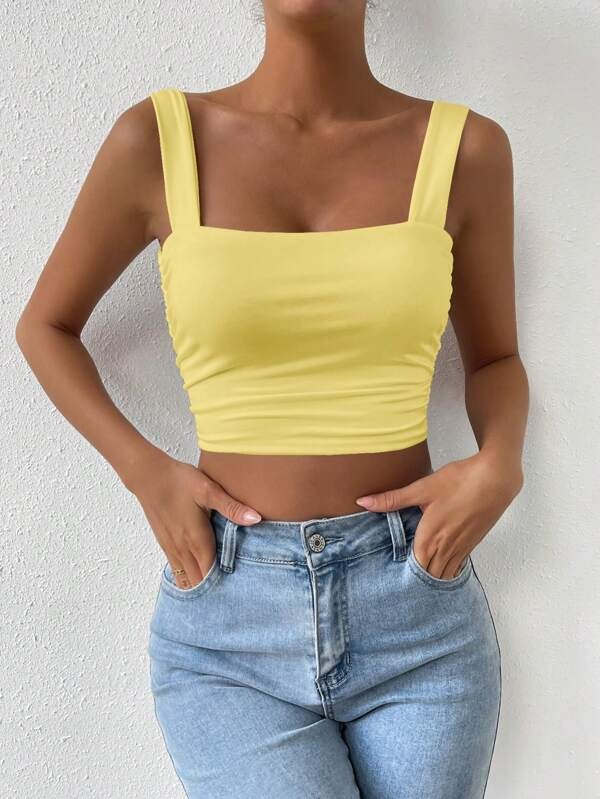เสื้อครอปสายเดี่ยว คอสี่เหลี่ยม สีเหลืองสดใส ผ้ายืดเรียบ ทรงเข้ารูปสดชื่นสวย