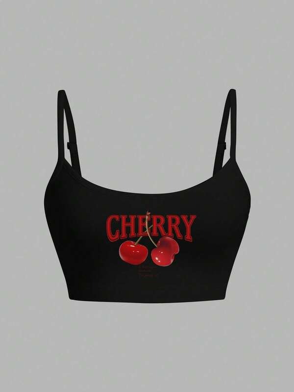 เสื้อครอปสายเดี่ยวพิมพ์ลาย Cherry กราฟิกสีดำ