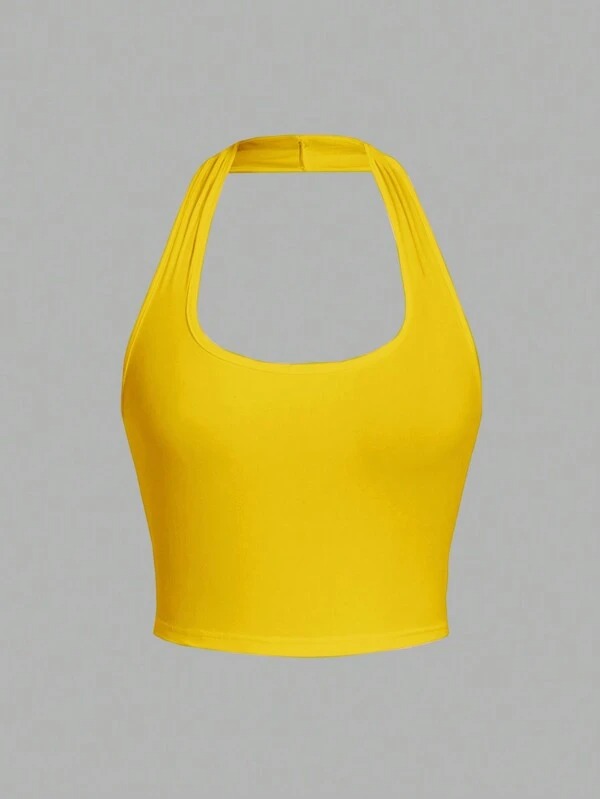 เสื้อครอปแบบฮาล์เตอร์ ผูกคอ สีเหลืองสดใส ผ้ายืดเรียบ ดูสดชื่นสไตล์ซัมเมอร์