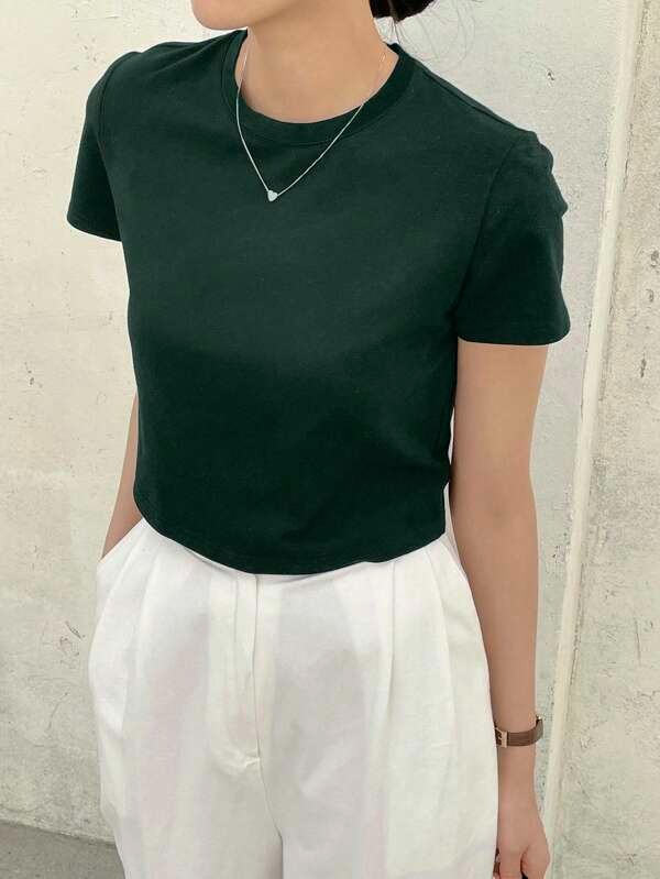 เสื้อครอปแขนสั้น คอกลม ผ้าเรียบ สีเขียวเข้ม ทรงเข้ารูปมินิมอล ใส่ง่ายทุกวัน